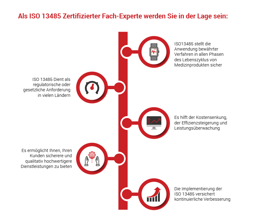Als ISO 13485-zertifizierter Fachmann ist es Ihre Entschlossenheit, Ihrem Unternehmen und/oder Ihren Kunden qualitativ hochwertige Produkte und Dienstleistungen anzubieten. Die Erlangung der notwendigen Kenntnisse und Fähigkeiten für den Betrieb eines ISO 13485-Arbeitsrahmens zeigt Ihren Einsatz, Ihr Unternehmen dabei zu unterstützen, kontinuierliche Verbesserungen und bessere Arbeitsprozesse sicherzustellen. Es zeigt auch, dass Sie sich der Bedeutung der Sicherheit und Leistungsfähigkeit von Medizinprodukten bewusst sind und wie ein Medizinprodukte-Qualitätsmanagementsystem genau das gewährleisten kann, was zur Kundenzufriedenheit führt. Ebenso kann es Ihnen neue Möglichkeiten verschaffen, wie zum Beispiel: Für große Unternehmen zu arbeiten, die qualitativ hochwertige Produkte und Dienstleistungen anbieten, und zwar Unternehmen die Ihr Wissen und Ihre Erfahrung in dieser Norm schätzen, während Sie gleichzeitig Ihr Verdienstpotential so maximieren können.