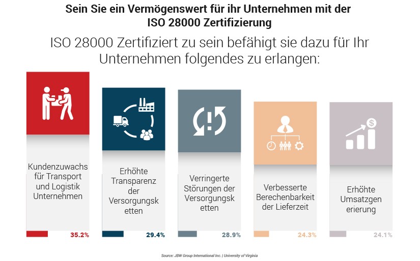 Eine ISO 28000 Zertifizierung zeigt, dass Sie ein Vermögenswert für Ihr Unternehmen sind und dass Sie ein vertrauenswürdiger Experte sind. Es ermöglicht Ihnen, Ihr Unternehmen bei der Einrichtung eines Security Management Systems (SMS) zu unterstützen, das die ausreichende Verwaltung und Kontrolle von Sicherheit gegen Bedrohungen gewährleistet, die aus logistischen Operationen und Supply-Chain Partnern stammen könnten. Mit einer ISO 28000 Zertifizierung erhalten Sie Marktsichtbarkeit und somit verhelfen Sie Ihrem Unternehmen Rentabilität und Qualität zu steigern.