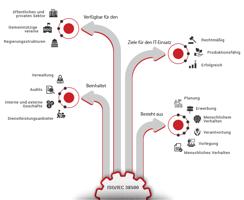 Die ISO/IEC 38500 unterstützt die Leitungsorgane dabei, sicherzustellen, dass der IT-Einsatz einen positiven Beitrag zur Leistungsfähigkeit der Organisation leistet. Durch die Erfüllung der ISO/IEC 38500-Anforderungen sind Unternehmen in der Lage, die IT-Nutzung zu überwachen, die Geschäftskontinuität und -nachhaltigkeit zu gewährleisten, so wie, die IT an die Geschäftsanforderungen auszurichten um eine angemessene Implementierung und den Betrieb von IT-Ressourcen sicherzustellen. Darüber hinaus hilft Ihnen diese Norm, das notwendige Fachwissen und die notwendigen Kenntnisse zu erlangen, um Organisationen bei der Einrichtung, Implementierung und kontinuierlichen Verbesserung eines Rahmens zu unterstützen, der den Grundsätzen und dem Modell guter IT-Unternehmensführung gemäß ISO/IEC 38500 entspricht.