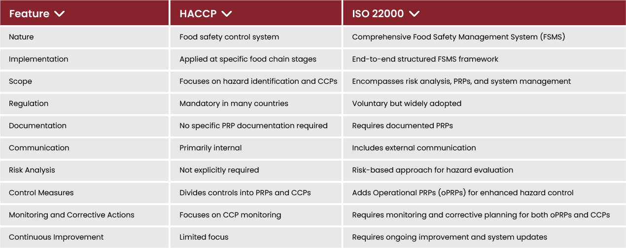 While HACCP and ISO 22000 share common goals, their scope and requirements differ: