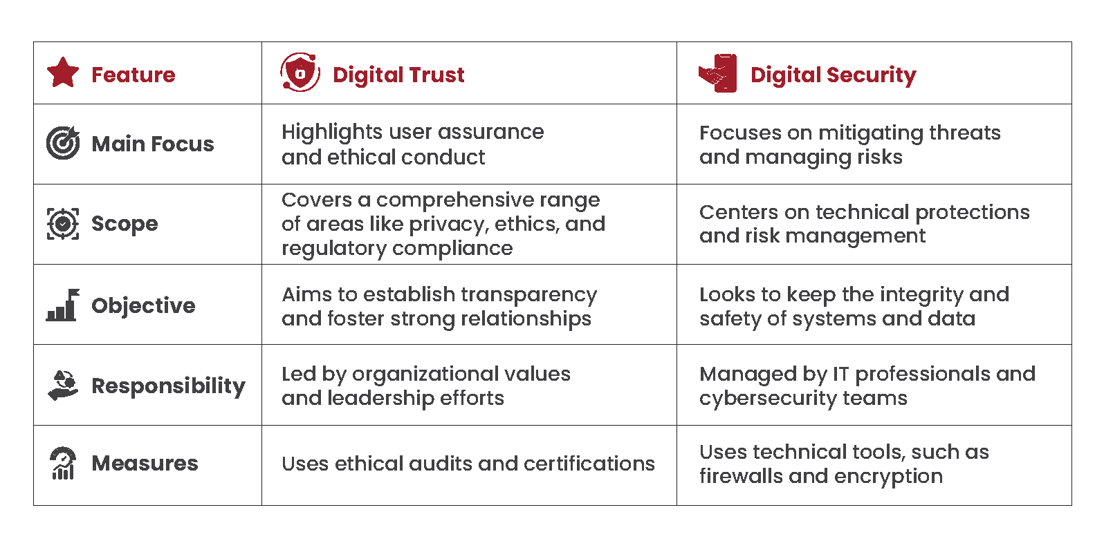 Digital trust represents the main idea of promoting user confidence through ethical practices and secure digital interactions, whereas digital security serves as a foundational element, devoted to protecting systems and data from threats.
