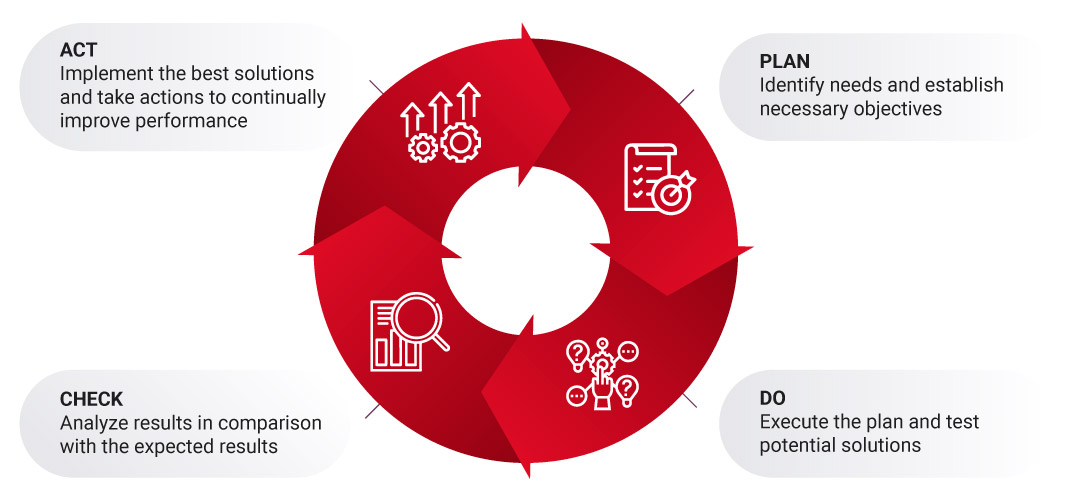 Plan-do-check-act (PDCA) is a management approach used to continually control and improve processes. This continual improvement cycle is easier to follow, and is effective strategy in managing health and safety processes.