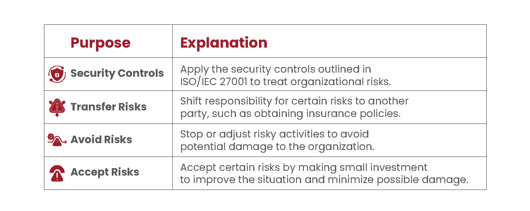 To address risks effectively, organizations can employ various strategies. These strategies should be aligned with ISO/IEC 27001 and tailored to the organization’s unique needs. A structured table or framework detailing solutions and their explanations can help ensure comprehensive coverage of risk mitigation efforts.