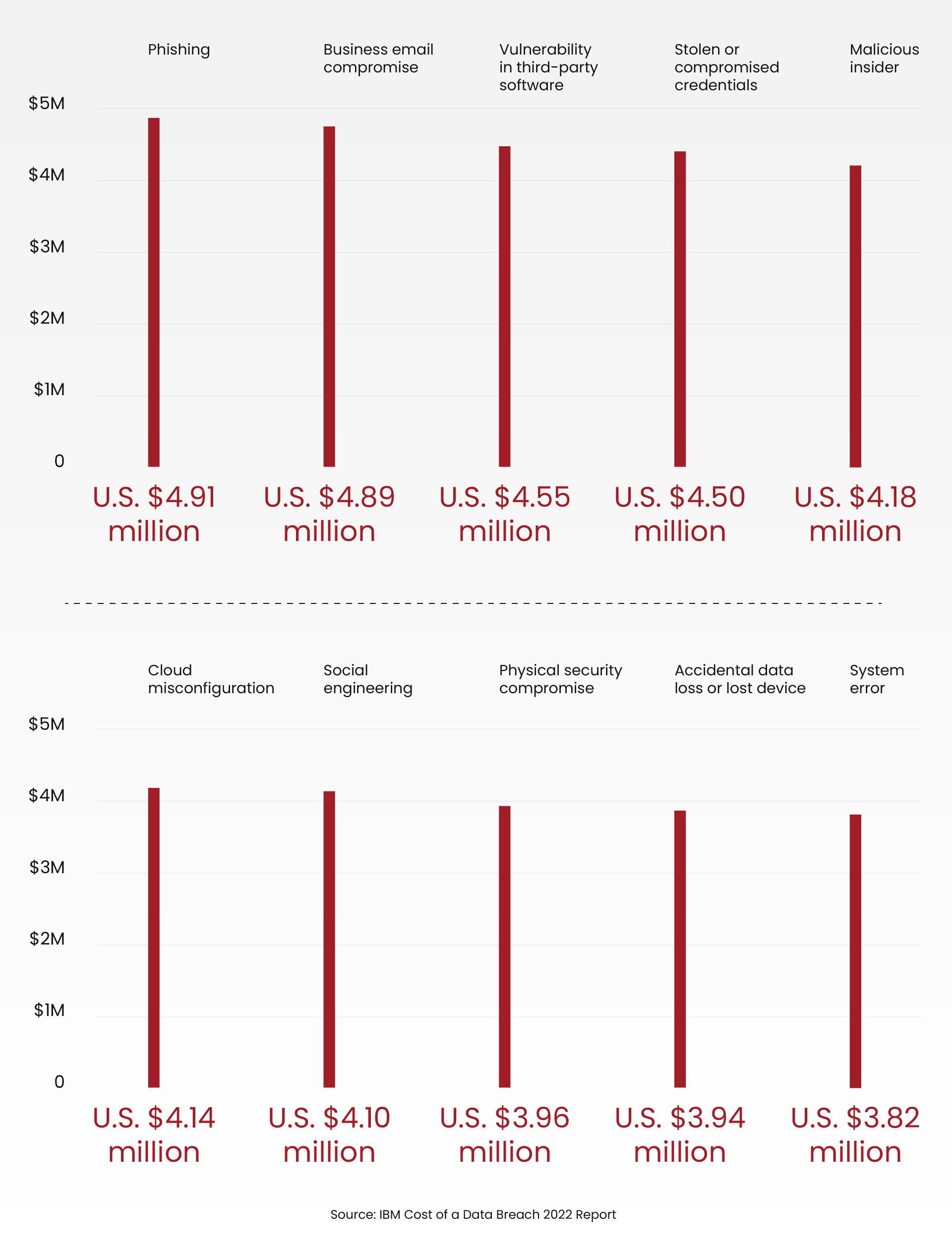 IBM reported that data breaches resulted in the loss of numerous millions of dollars, with the average cost of a data breach in the United States reaching $9.44 million. Each cyber-attack method incurred costs millions of dollars, as illustrated in the infographic below.
