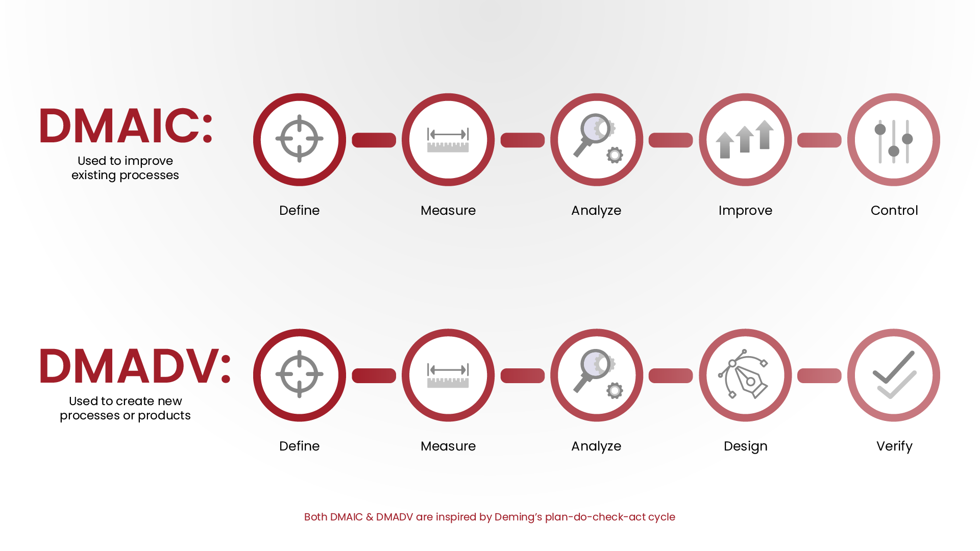 DMAIC and DMADV are two distinct approaches that differ from each other (see the graph below). On one hand, DMAIC is primarily concerned with improving existing processes, whereas, on the other, DMADV is a proactive approach focused on improving the quality of new processes and products, as well as eliminating potential problems before they occur.