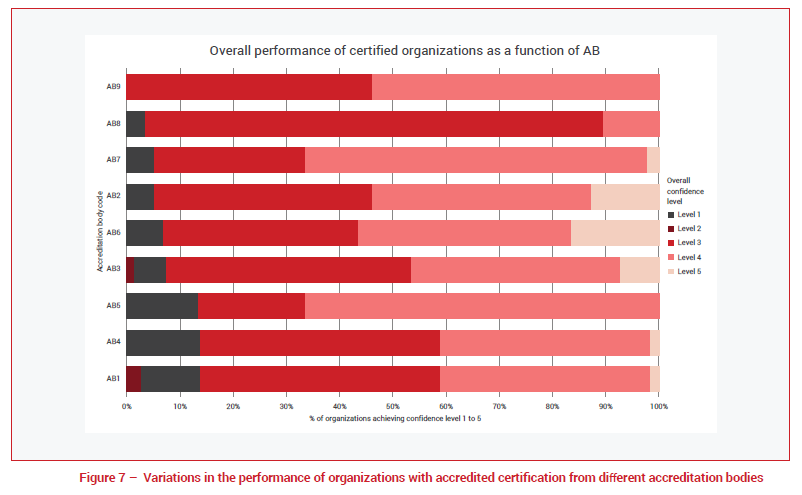 Similarly, the variations in the performance of organizations with accredited certification from different accreditation bodies are being displayed in the figure below. It is presented that the majority of organizations certified with certain CB’s performed well, in comparison with a small number of organizations which expressed doubt about the value of the certification: