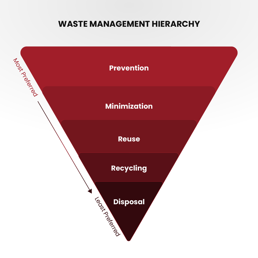 The waste management hierarchy is an approach that focuses on prioritizing waste management practices with the goal to achieve sustainable waste management. It establishes the order of waste management options, from the most preferred to the least preferred one: