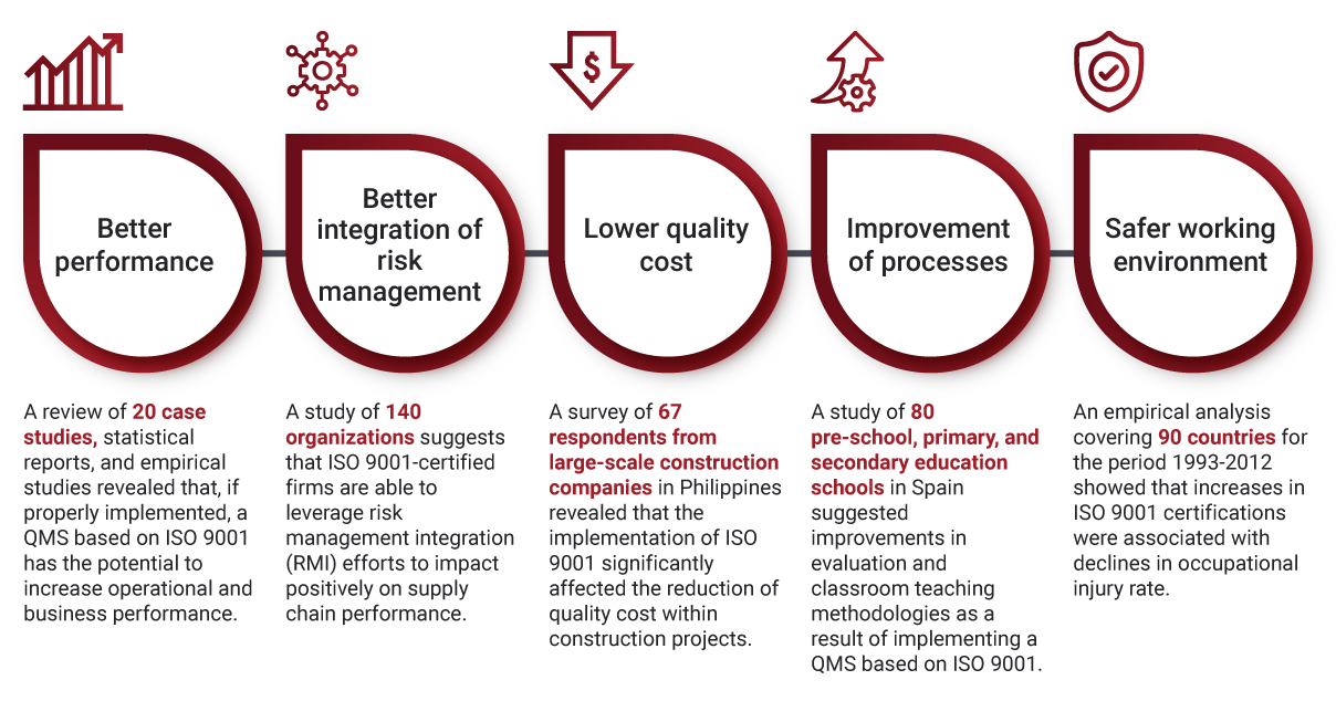 Ever since its initial publication, ISO 9001 has been the most recognized and widely used management system standard. A QMS based on ISO 9001 enables organizations to ensure success in the long term. In addition, a certified QMS provides additional assurance to customers and business associates, which further improves the business of an organization.