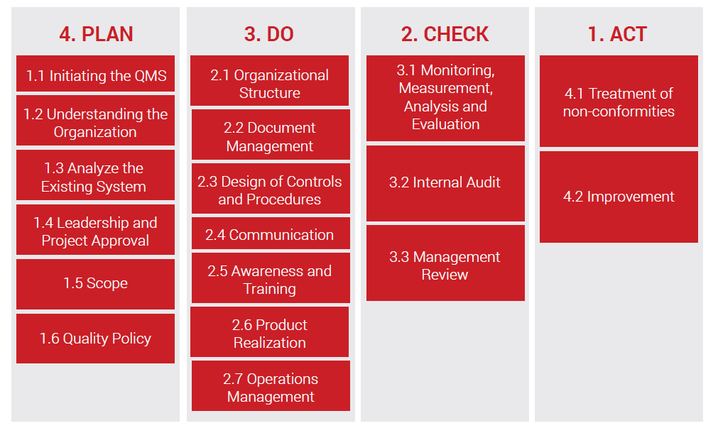 IMS2 is based on the PDCA cycle divided into four phases: Plan, Do, Check and Act. Each phase has between 2 and 8 steps for a total of 18 steps. In turn, these steps are divided into 101 activities and tasks. This ‘Practical Guide’ considers the key phases in your implementation project from start to finish and suggests the appropriate ‘best practice’ for each one, while directing your to further helpful resources as you embark on your ISO 13485 journey.