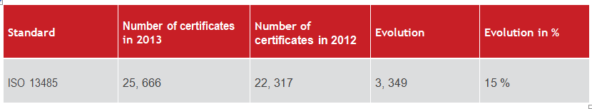 According to the latest ISO Survey of Management System Standard Certifications, up to the end of December 2013, at least 25, 666 ISO 13485:2003 certificates, a growth of 15 % (+3, 349), had been issued in 95 countries and economies, two less than in the previous year.