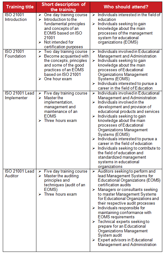 PECB training courses are offered globally through a network of authorized training providers; they are available in several languages and include the following: Introduction, Foundation, Lead implementer, and Lead Auditor courses. The table below provides a short description of PECB’s official training courses for the ISO 21001 scheme.