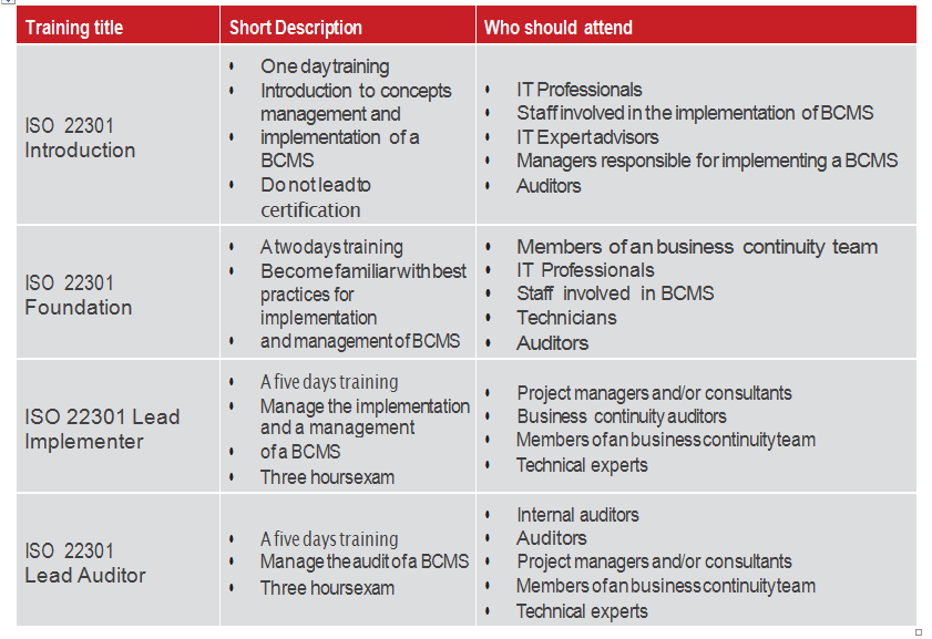 PECB training courses are offered globally through a network of authorized training providers and they’re available in several languages and include introduction, foundation, implementer and auditor courses. The table below gives a short description about PECB’s official training courses for Business continuity management system based on ISO 22301.