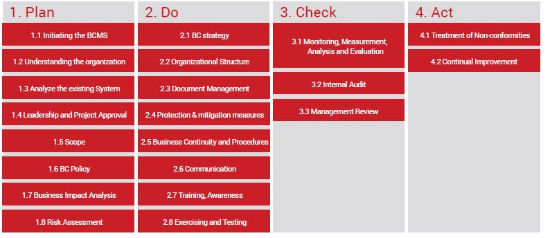 Once the BCMS is implemented, ISO 22301requires permanent monitoring of the system as well as periodic reviews to improve its operation: