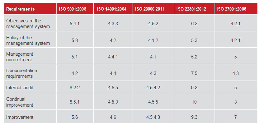 The table below shows how a BCMS can be considered jointly with other management systems. This will authorize the organization to envision “combined audits” in order to achieve their compliance goals with adequate effort and budget.