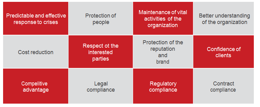 The adoption of an effective business continuity management process within an organization will have benefits in a number of areas, examples of which include: