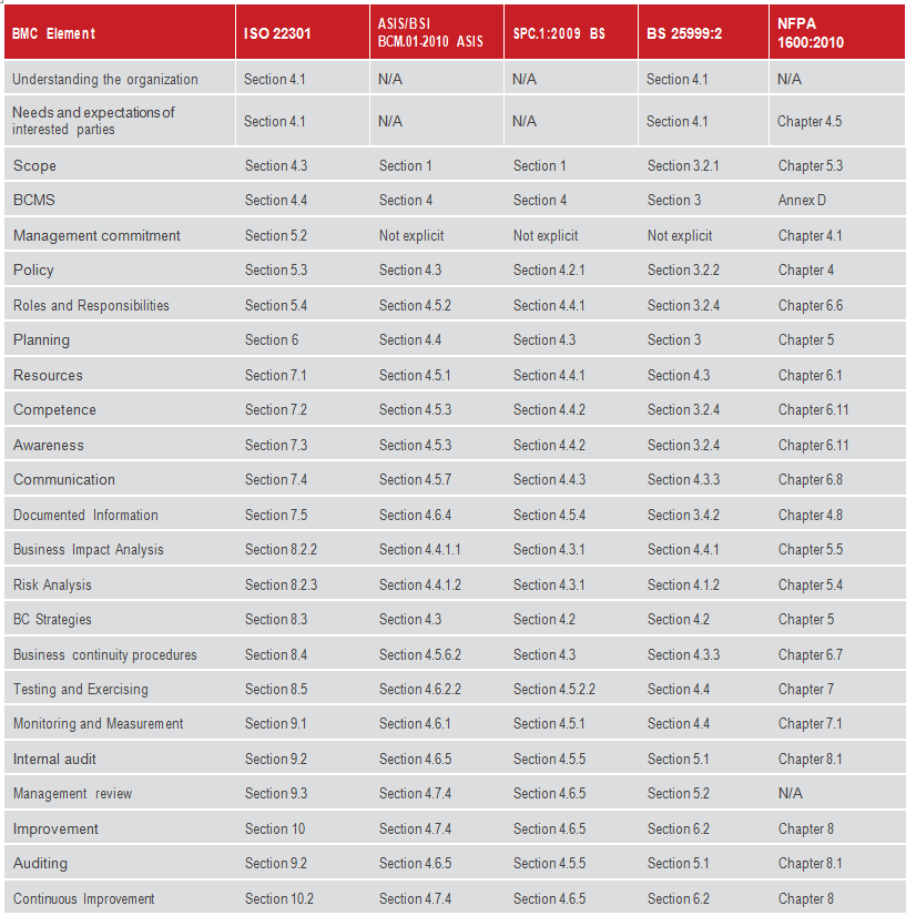 In the table below, the first column lists the usual components that more or less all BCM standards propose. Other columns describe for each standard where the information for each category can be found. This table doesn’t indicate the usefulness of content of each of these standards, only the fact that the information can be found within the standard.