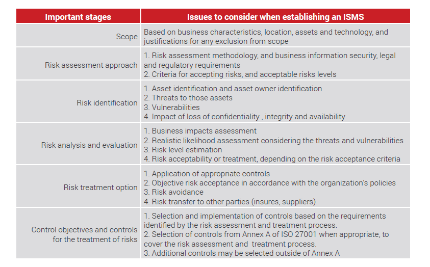 To establish an ISMS the organization needs to define the ISMS which includes the following steps: