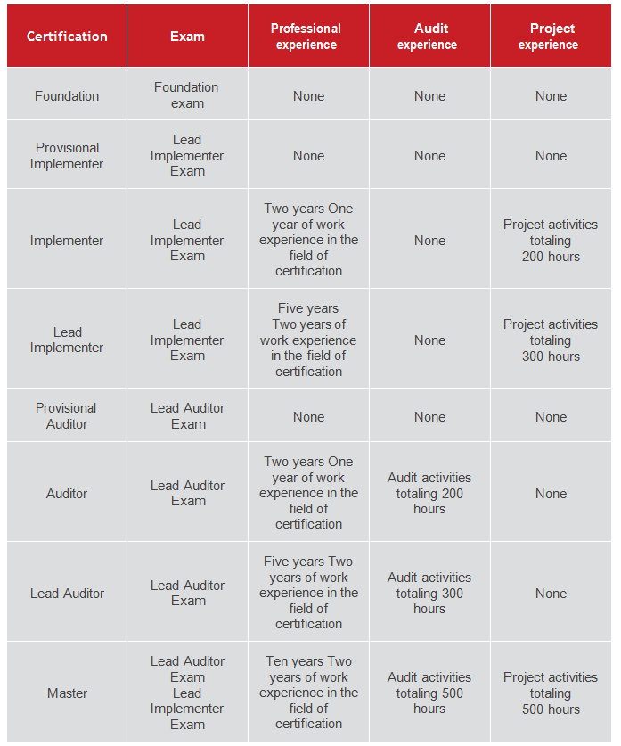 Based on your overall professional experience and your acquired qualifications, you will be granted one or more of these certifications based on projects or audits activities you have been performing by the past or which you are currently working on.