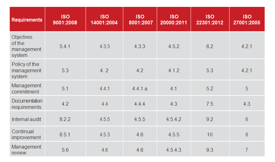 In addition, the table below presents the general requirements of several standards, which also serves as a comparing tool between SCSMS and other management systems. This will authorize the organization to envision “combined audits” in order to achieve their compliance goals with adequate effort and budget.