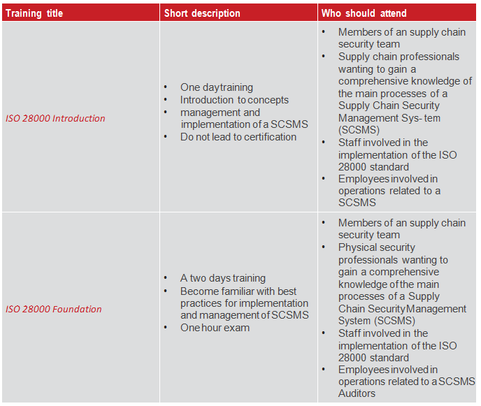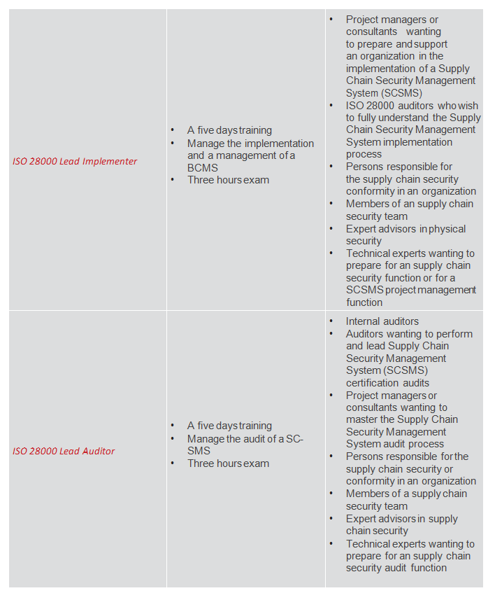 The table below gives a short description relating PECB’s official training courses for supply chain security systems based on ISO 28000.