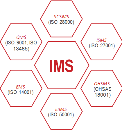 The integration of all management systems into a single centrally managed system is defined as an Integrated Management System (IMS) and it includes standards such as: