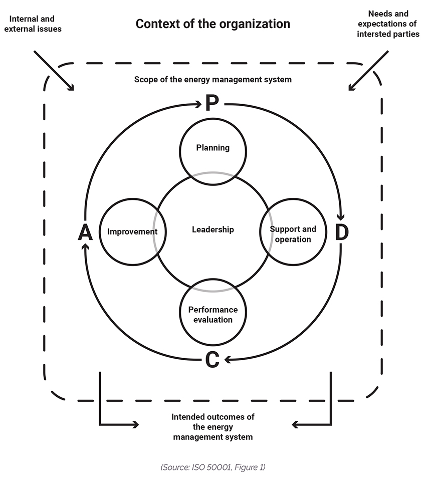All ISO management system standards structure has been considered to ensure that they fulfil the annex SL framework for the purpose of integration of multiple management systems. This framework entails establishing high level of compatibility among all management system standards. Therefore, it uses the core text, terms, and definitions that are present in every standard related to management systems. The figure below shows the PDCA cycle (Plan-Do-Check-Act), which is a four-step management approach used by organizations to control and continually improve the energy management processes.