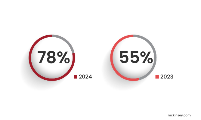 Selon McKinsey, 78 % des organisations ont déclaré intégrer l’IA dans au moins une fonction de leur entreprise en 2024, contre 55 % en 2023, ce qui témoigne de son intégration rapide dans les opérations quotidiennes.