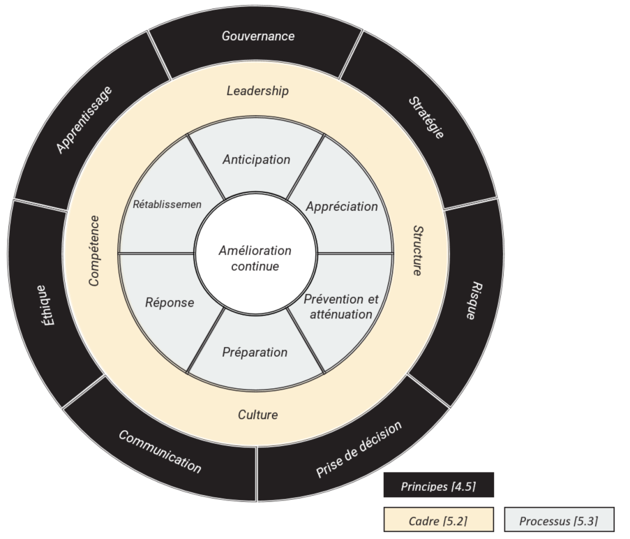 La norme ISO 22361 recommande aux organismes d’adopter une approche structurée de la gestion de crise en établissant un cadre de gestion de crise basé sur le leadership, la structure, la culture et la compétence, et en adhérant aux principes de gestion de crise, que sont la gouvernance, la stratégie, le risque, la prise de décision, la communication, l’éthique et l’apprentissage.