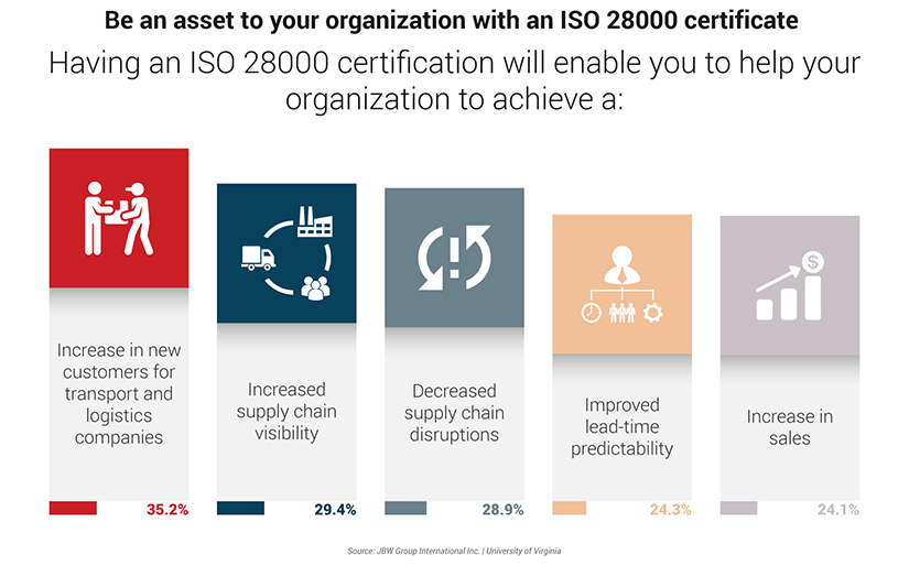 ISO 28000 인증은 여러분이 기관의 자산이며 신뢰할 수 있는 전문가임을 증명합니다. ISO 28000 인증을 받게 되면, 기관이 물류 운영 혹은 공급망 파트너와 관계된 보안과 위협을 적절히 관리하고 통제하는 SMS를 구축할 수 있도록 지원을 제공할 수 있습니다. ISO 28000 인증으로 시장에서의 가시성을 확보하고, 기관의 생산성과 품질 향상에도 도움을 줄 수 있을 것입니다.